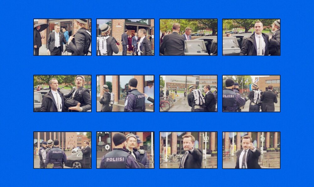 Videolla puvuntakkiin ja pipoon sonnustautunut nuori mies lähestyy mikrofonin kanssa tasavallan presidentti Alexander Stubbia, kun tämä on astumassa ulos Aalto-yliopiston rakennuksesta.